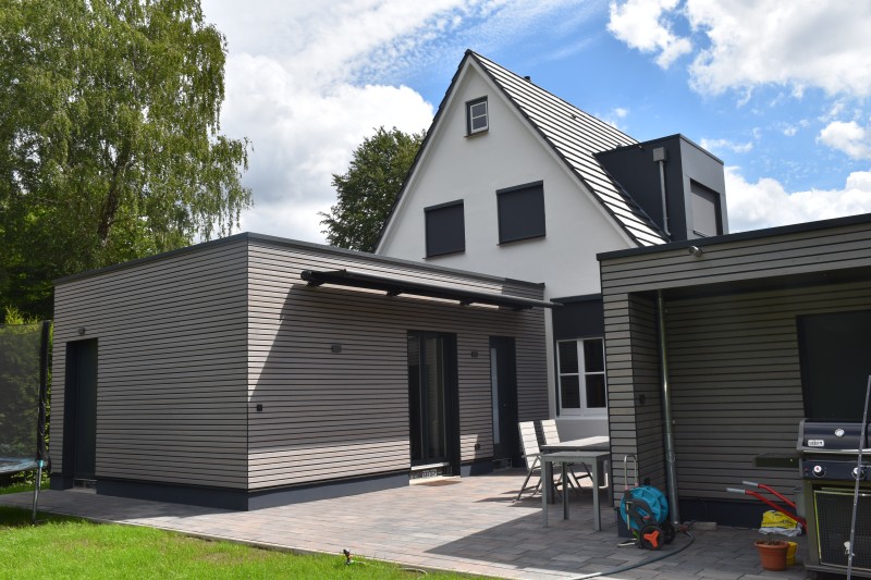 < 4 / 7 > Erweiterung eines Einfamilienhauses Hamburg, 2021 LPH 5-8 Im Bau. Sanierung des Altbaus. Dachdeckung, Gauben und Fassade. Anbau an den Altbau und Garagenneubau. Holzrahmenbau mit Cellulosedämmung.