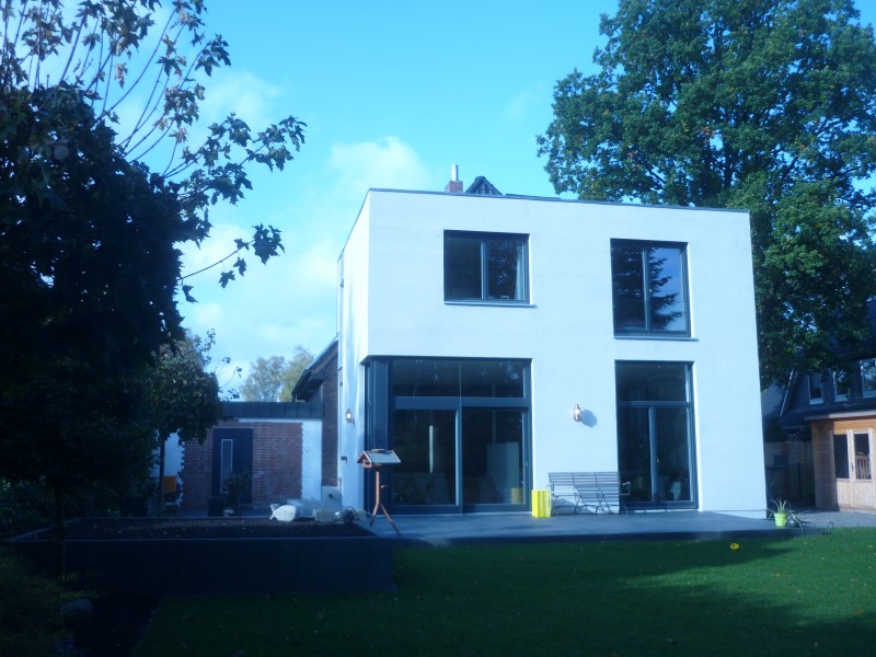 Anbau: Zweigeschossiger Anbau zum Garten, Öffnung der Küche in den Anbau mit vorgelagertem Podest für einen Esstisch. Transparenter Anschluss des Anbaus an den Altbau um die Räumen des Altbaus weiterhin mit Tageslicht zu versorgen. Holzrahmenbau mit Holzfaserdämmung, Vollholzdecken.