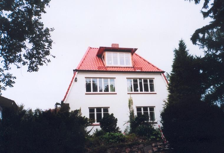 Vordächer- laut Bauherrin "ein Hauch von Nichts"- über Hauseingang und Kellerabgang.