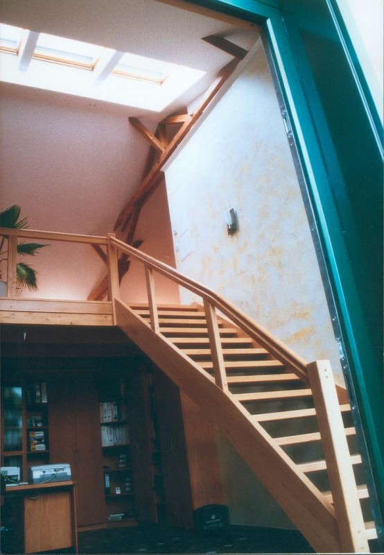 < 5 / 7 > Umbau eines Stallgebäudes zu einem Büro mit Holzbauausstellung Insel, 2001 Entwurf, Baubegleitung Niedrigenergiestandard, unter Nutzung alternativer Energieformen und einer kontrollierten Lüftungsanlage. Ökologischer Ausbau.